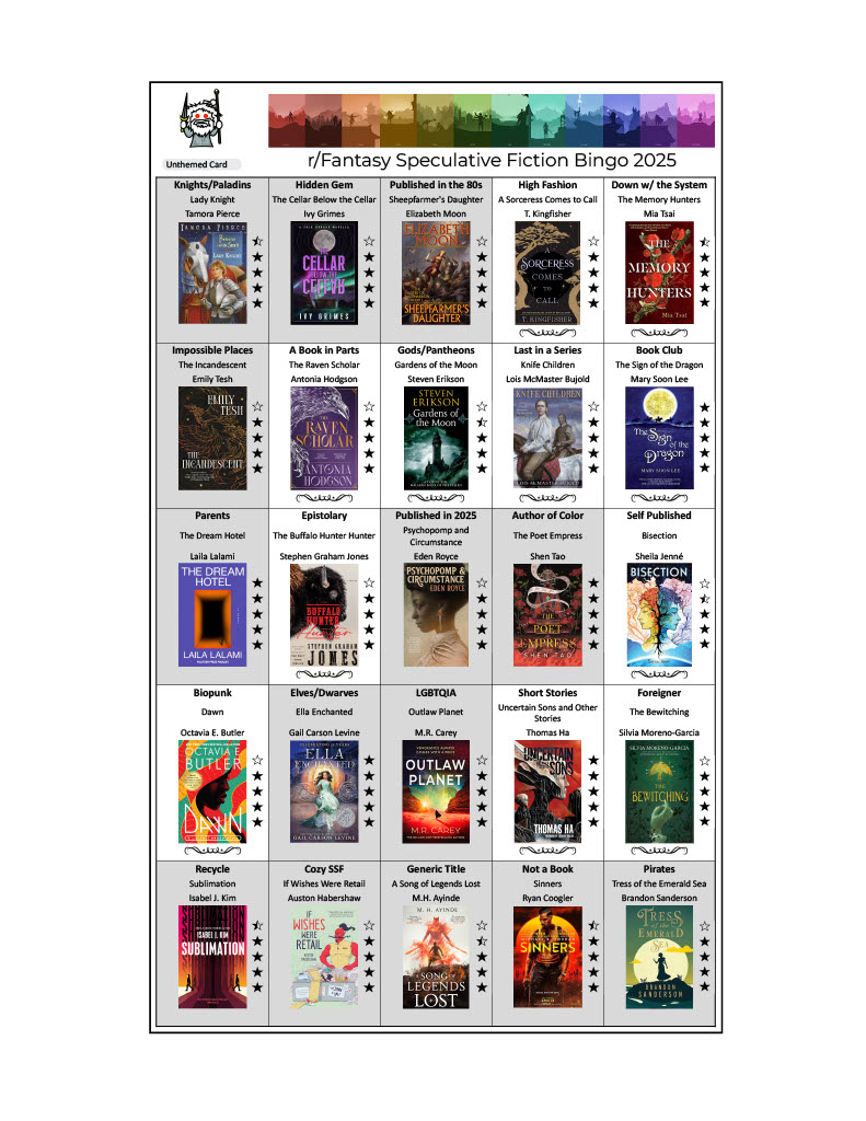 For the past few years, my habit has been to fill out two complete r/Fantasy Bingo cards. One has some theme or another (in 2025, it was Spot the Title), and the other doesn’t. Seeing as how the second is usually completed only near the end of the Bingo season, I’ve decided to postpone posting my second card until the release of 2026 Bingo, so that I can share the ways in which these books could fit Bingo in the new year.